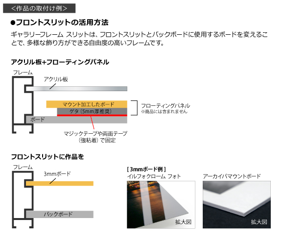・フロントスリットはアクリル板や作品パネル(3mm)をセット可能